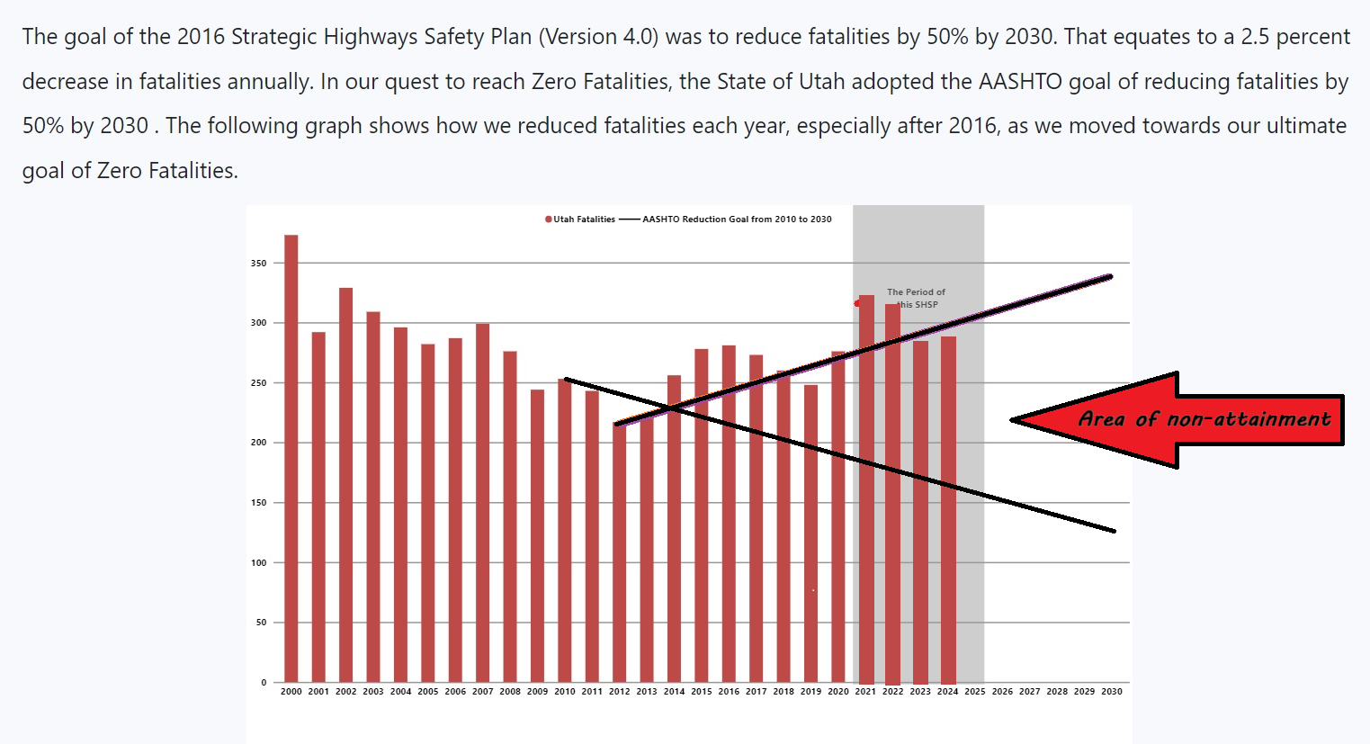 In 2016, UDOT set a goal to reduce traffic fatalities by 50% by 2030. The problem is that fatalities are not going down, in fact they are going up. If UDOT's strategies were working, we would be experiencing under 200 fatalities in 2025. A number we have tragically surpassed in October.